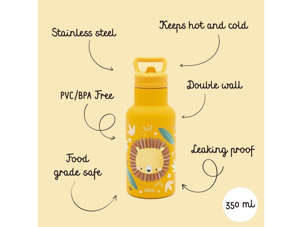 Termofľaša so slamkou s motívom odvážneho levíka Chompy bude spoločníkom na tisíc dobrodružstiev. S objemom 350 ml udrží nápoj teplý aj studený a vďaka slamke je ideálna aj pre menšie deti. Vnútro je z nehrdzavejúcej ocele, no fľaša zostáva ľahká a ľahko prenosná vďaka praktickému uzáveru s uškom. S termofľašou SASSI môžu aj tí najmenší slobodne objavovať svet.