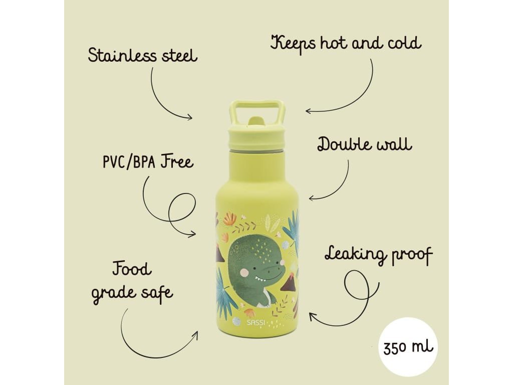 Termofľaša so slamkou s motívom silného dinosaura Crackyho bude spoločníkom na tisíc dobrodružstiev. S objemom 350 ml udrží nápoj teplý aj studený a vďaka slamke je ideálna aj pre menšie deti. Vnútro je z nehrdzavejúcej ocele, no fľaša zostáva ľahká a ľahko prenosná vďaka praktickému uzáveru s uškom. S termofľašou SASSI môžu aj tí najmenší slobodne objavovať svet.