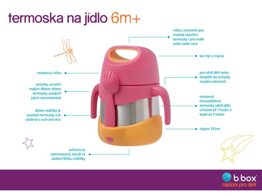 Termoska je vhodná pre malé deti od prvých príkrmov, ale diely odnímateľným "uškom" a dolnému krytu sa hodí sa aj pre veľké deti a rodičov na obľúbené raňajky či obed, šalát, polievku, ovocie i zeleninu. Termoska udrží jedlo teplé až 5 hodín a studené až 7 hodín.