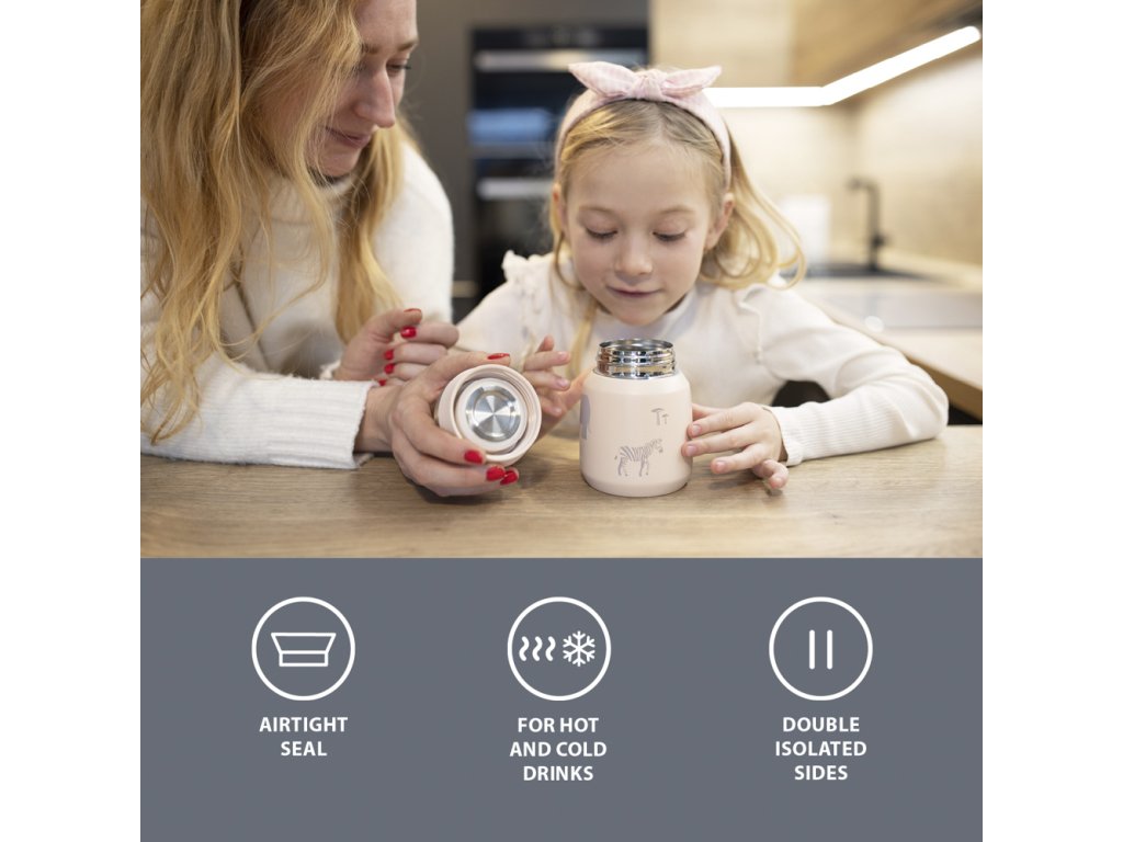 Vysokokvalitná termoska na jedlo a občerstvenie s objemom 300 ml udrží teplé jedlo až 12 hodín a studené jedlo až 24 hodín. Je vyrobená z kvalitnej nehrdzavejúcej ocele, ktorá je odolná proti korózii. Tesne priliehajúce viečko zaisťuje, že termoska nevyteká. Vďaka vákuovej izolácii sa termoska pri naplnení horúcim obsahom zvonku nezahrieva.