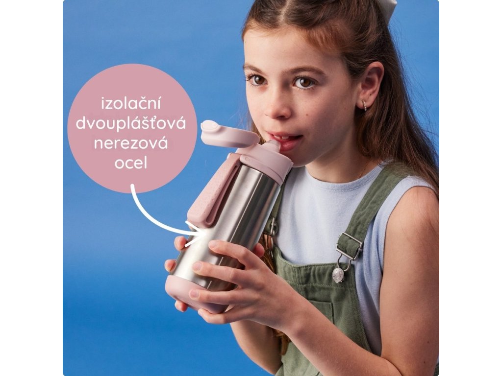 Dvojplášťová termoska z nerezovej ocele s mäkkým silikónovým cumlíkom udrží tekutiny studené až 15 hodín a teplé až 8 hodín. Viečko termosky v zavretom stave zaistí, že je fľaša nepriepustná. Už žiadne premočené tašky, knihy a sedačky v aute! Pre otvorenie stačí stlačiť tlačidlo. Cumlík vďaka viečku zostáva zakrytý, čistý a hygienicky udržiavaný. Silikónová rukoväť umožňuje deťom fľašu ľahko nosiť a vyťahovať zo školských a športových tašiek.
