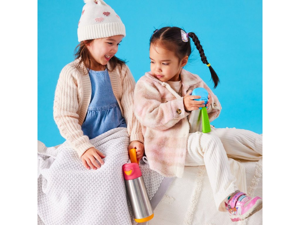 Varovné a bezpečnostné informácie: Nepoužívajte s kyslými tekutinami, môže dôjsť ku korózii. Niektoré tekutiny môžu spôsobiť zafarbenie produktu. Toto nemá vplyv na funkčnosť produktu a nie je dôvodom na reklamáciu. Do termosky nepatria z bezpečnostných dôvodov vriace/horúce a perlivé nápoje. Nepoužívajte pre tekutiny teplejšie ako 45°C (hrozí obarenie). Pokiaľ používate termosku na teplé nápoje, buďte opatrní pri otváraní, pretože tekutina môže ľahko vystreknúť. Vždy skontrolujte teplotu nápoja pred podaním dieťaťu! Nie je vhodné pre deti mladšie ako 3 roky. Nenechávajte dieťa bez dozoru dospelej osoby. Nenechajte dieťa pri používaní s produktom behať alebo sa inak pohybovať. Pred každým použitím skontrolujte, či sú všetky časti produktu v poriadku a pri známkach opotrebovania nedávajte dieťaťu a zlikvidujte. Nenechávajte na priamom slnku alebo pri zdroji tepla. Obaly a nepoužívané časti uchovávajte mimo dosahu detí. Nepatrí do rúry, mrazničky ani mikrovlnnej rúry. Obaly a nepoužívané časti uchovávajte mimo dosahu detí.