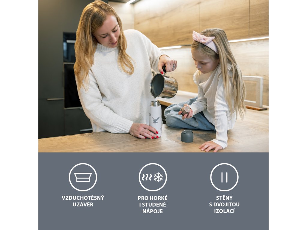 Kvalitná termoska na tekutiny s objemom 400 ml udrží horúce nápoje až 12 hodín, studené nápoje až 24 hodín. Je vyrobená z kvalitnej nehrdzavejúcej ocele, ktorá je odolná proti korózii. Tesne priliehajúce viečko zaisťuje, že termoska nevyteká, a vrchný uzáver na pohodlné nalievanie zaručuje, že sa vám tekutina nevyleje ani pri jazde autom po nerovnej ceste, vďaka dvojitému uzáveru si môžete byť istí aj tým, že dieťa tekutinu z termosky nevyleje. Viečko termosky možno použiť ako hrnček.