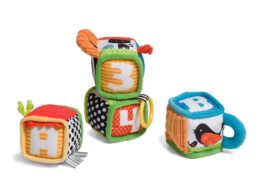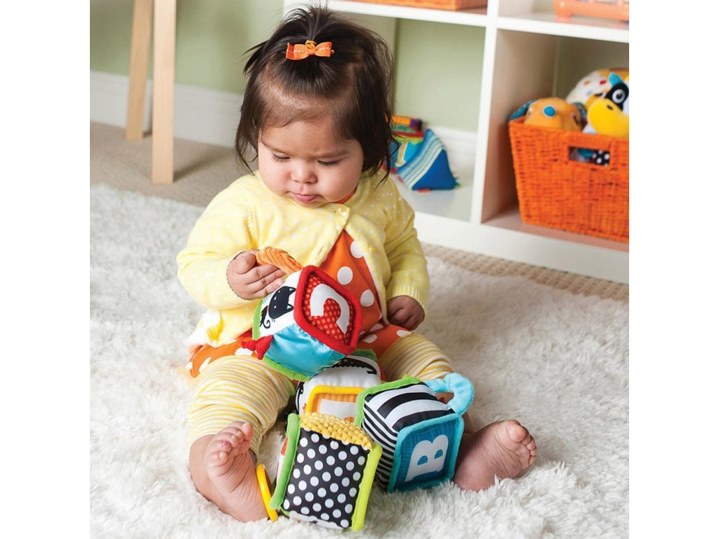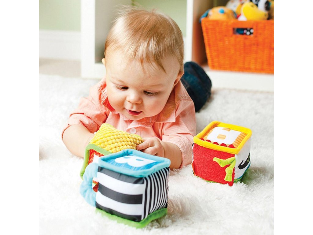 Štyri mäkké textilné kocky ponúka rôznorodé aktivity a textúry na skúmanie a pozorovanie. Kocky je možné skladať na seba i s nimi hádzať. V staršom veku dieťaťa s ich pomocou môžete dieťa učiť farby a prvé písmenká aj čísla.