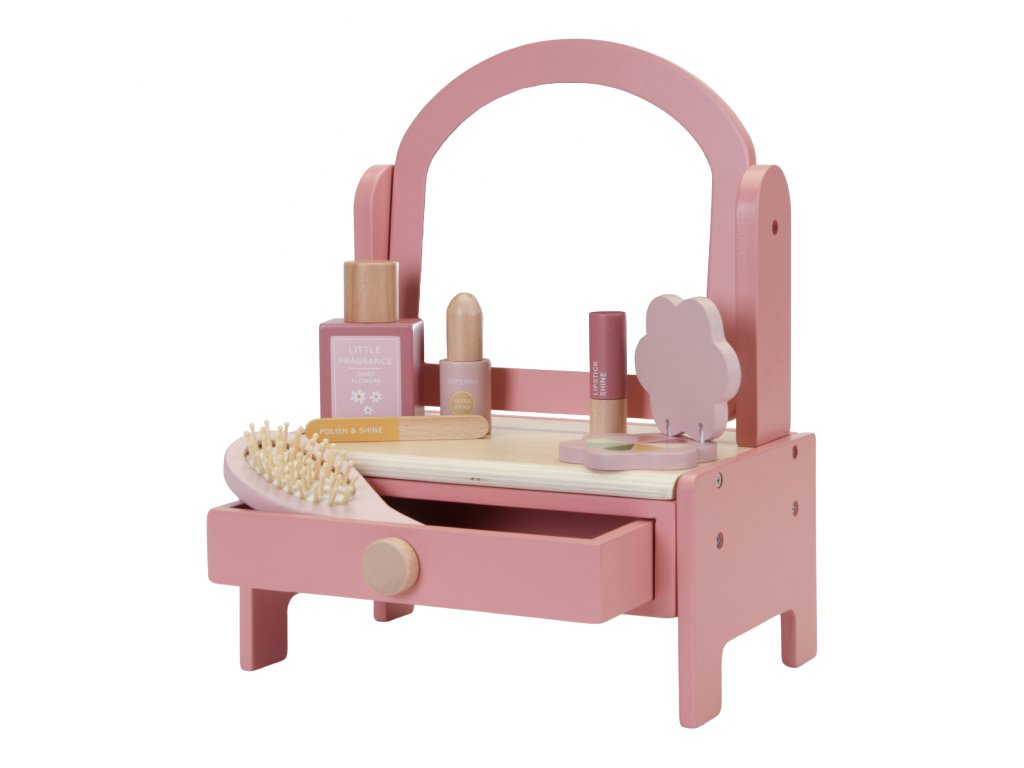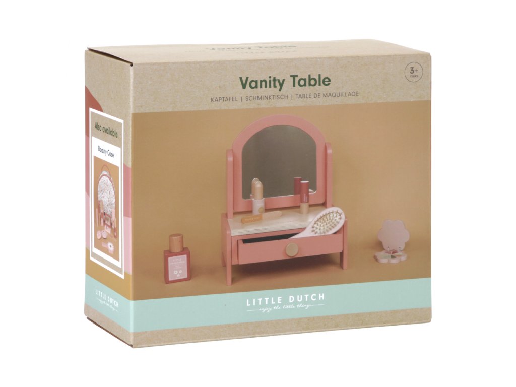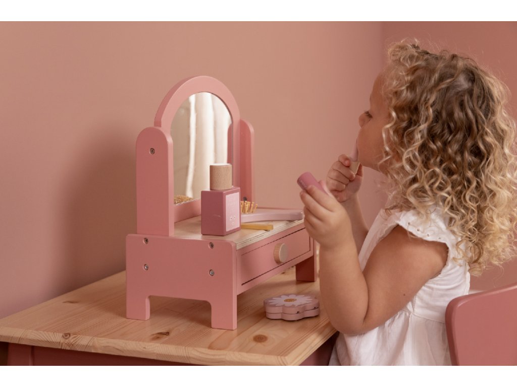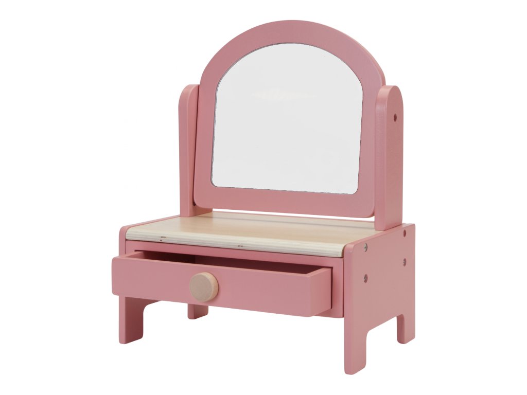 Zrkadielko, zrkadielko povedz že mi, kto je najkrajší v tejto zemi? Tento ružový drevený detský toaletný stolík nabáda k nápaditej hre a poskytuje nekonečnú zábavu. Toaletný stolík obsahuje otočné zrkadlo a šesť drevených kozmetických produktov, ako je kefa na vlasy, rúž, parfum, očné tiene, pilník na nechty a lak na nechty. Toaletný stolík má tiež odkladaciu zásuvku na uloženie gumičiek do vlasov a sponiek (nie sú súčasťou balenia).