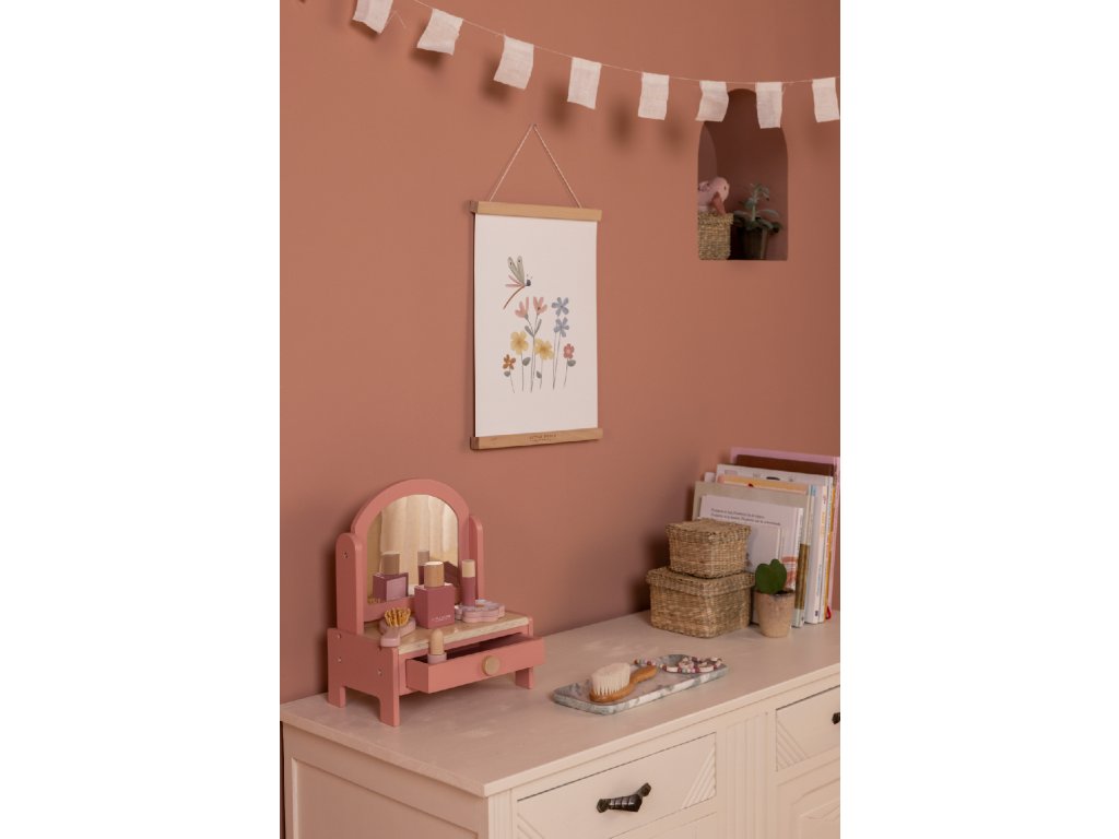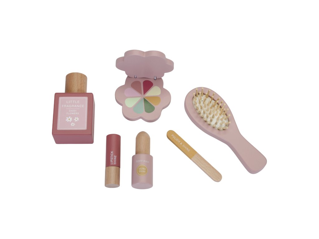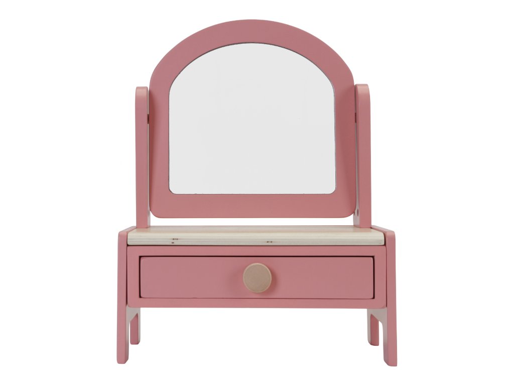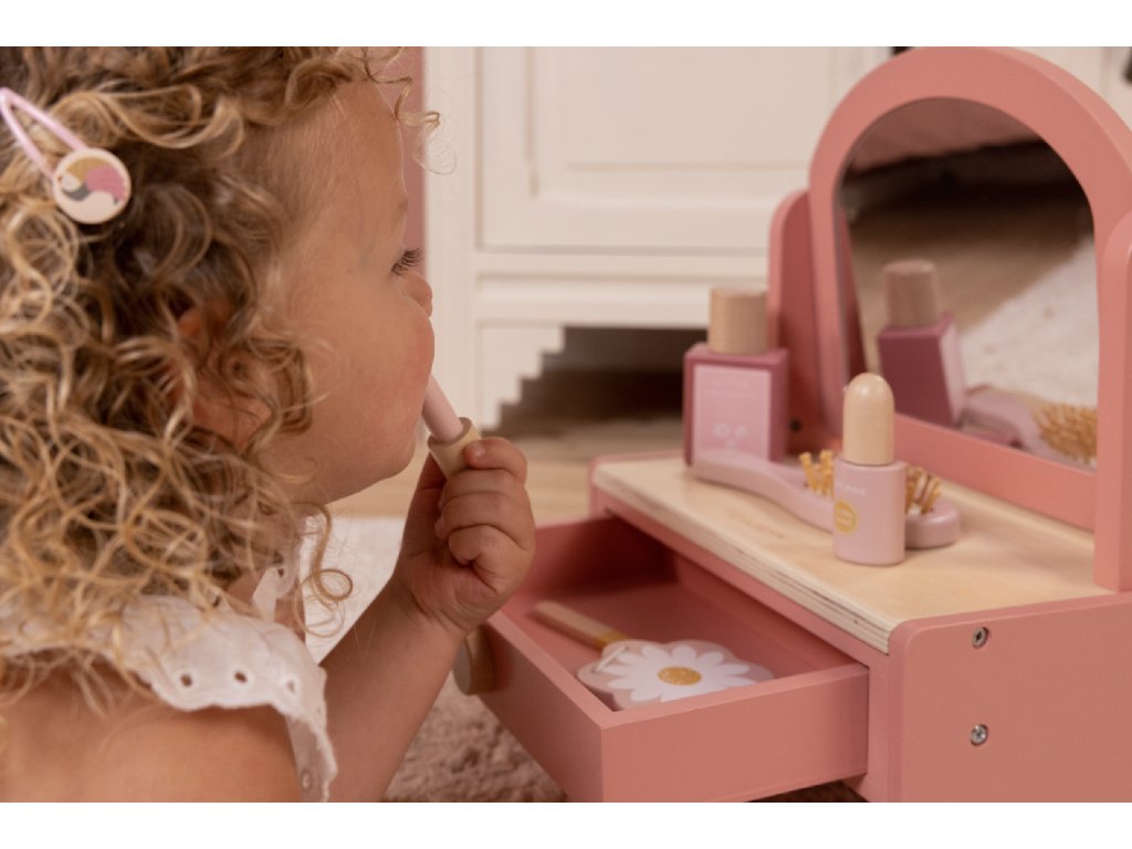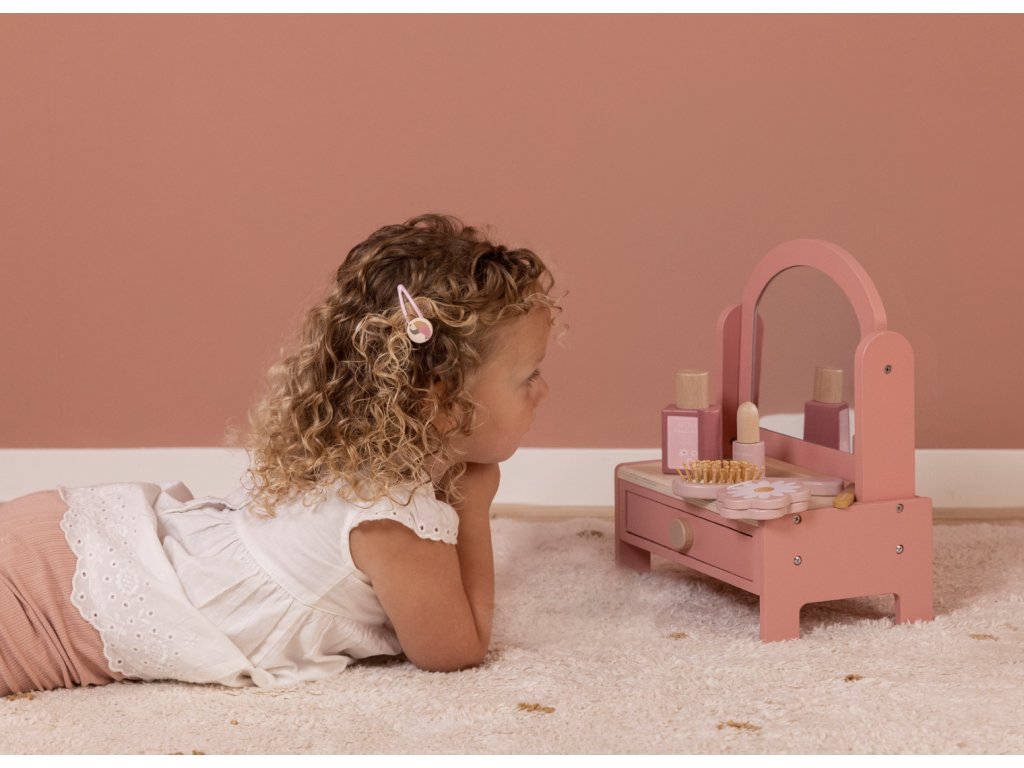 Zrkadielko, zrkadielko povedz že mi, kto je najkrajší v tejto zemi? Tento ružový drevený detský toaletný stolík nabáda k nápaditej hre a poskytuje nekonečnú zábavu. Toaletný stolík obsahuje otočné zrkadlo a šesť drevených kozmetických produktov, ako je kefa na vlasy, rúž, parfum, očné tiene, pilník na nechty a lak na nechty. Toaletný stolík má tiež odkladaciu zásuvku na uloženie gumičiek do vlasov a sponiek (nie sú súčasťou balenia).
