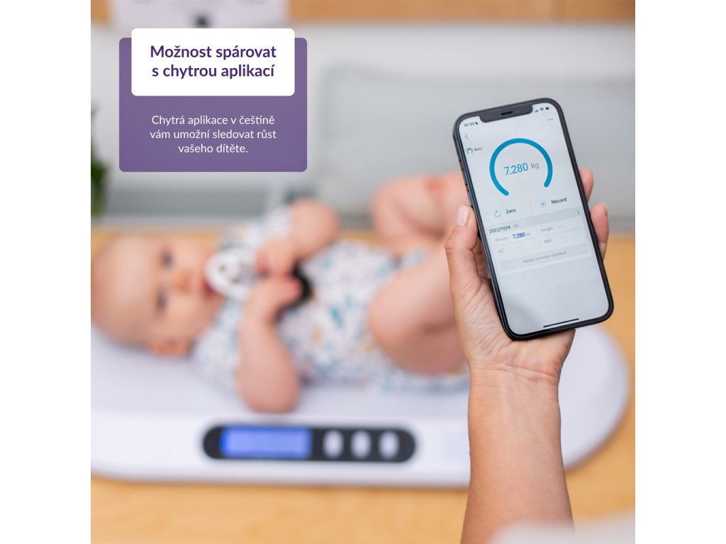 Stiahnite si smart aplikáciu, ktorá je dostupná kompletne v slovenčine, a sledujte rast a vývoj dieťaťa v čase. Aplikácia poskytuje prehľadnú históriu meraní, z ktorých vyplýva jasná informácia ako bábätko priberá a rastie. Zároveň dokáže z dát vytvoriť graf vývoja a jej prostredníctvom je možné ovládať funkcie TARE alebo HOLD. Váhu je možné používať ako s využitím aplikácie, tak aj bez nej.