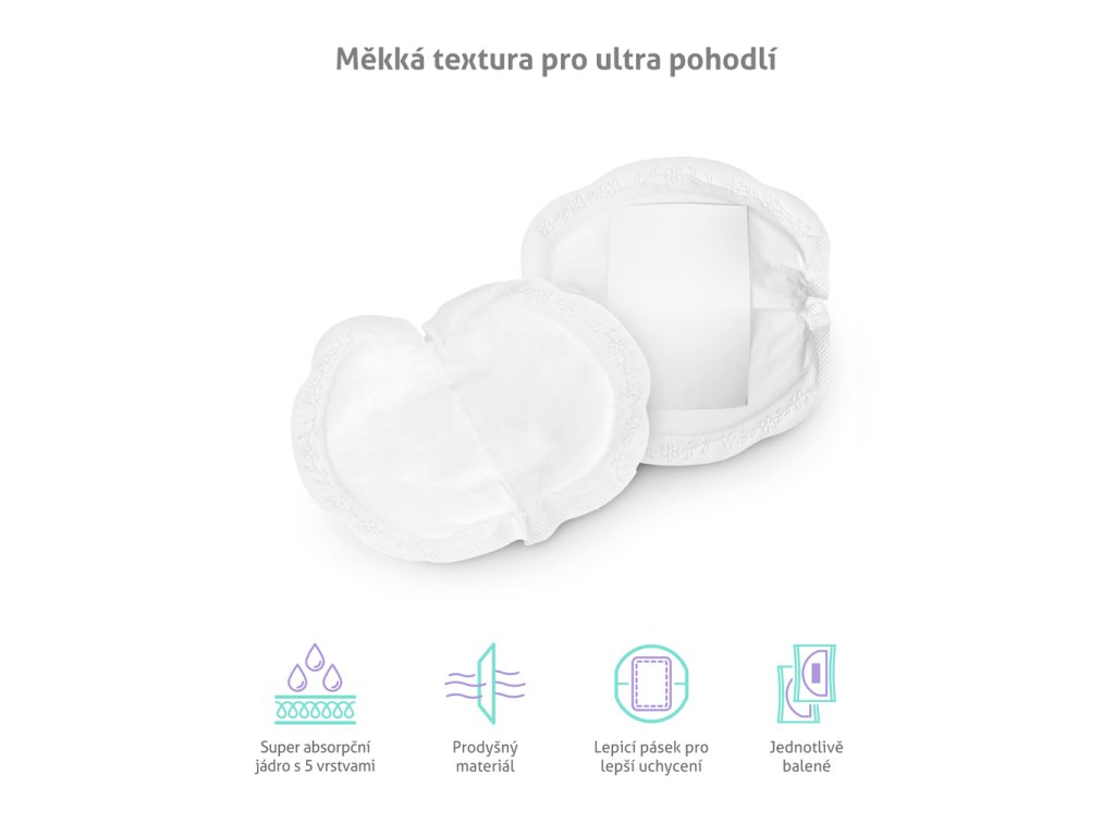 Prsné vložky s povrchom mäkkej textúry sú pre okolie úplne neviditeľné vďaka hrúbke iba 2 mm. Pri svojej tenkosti sa do nich zmestí pohodlne až 80 ml mlieka.