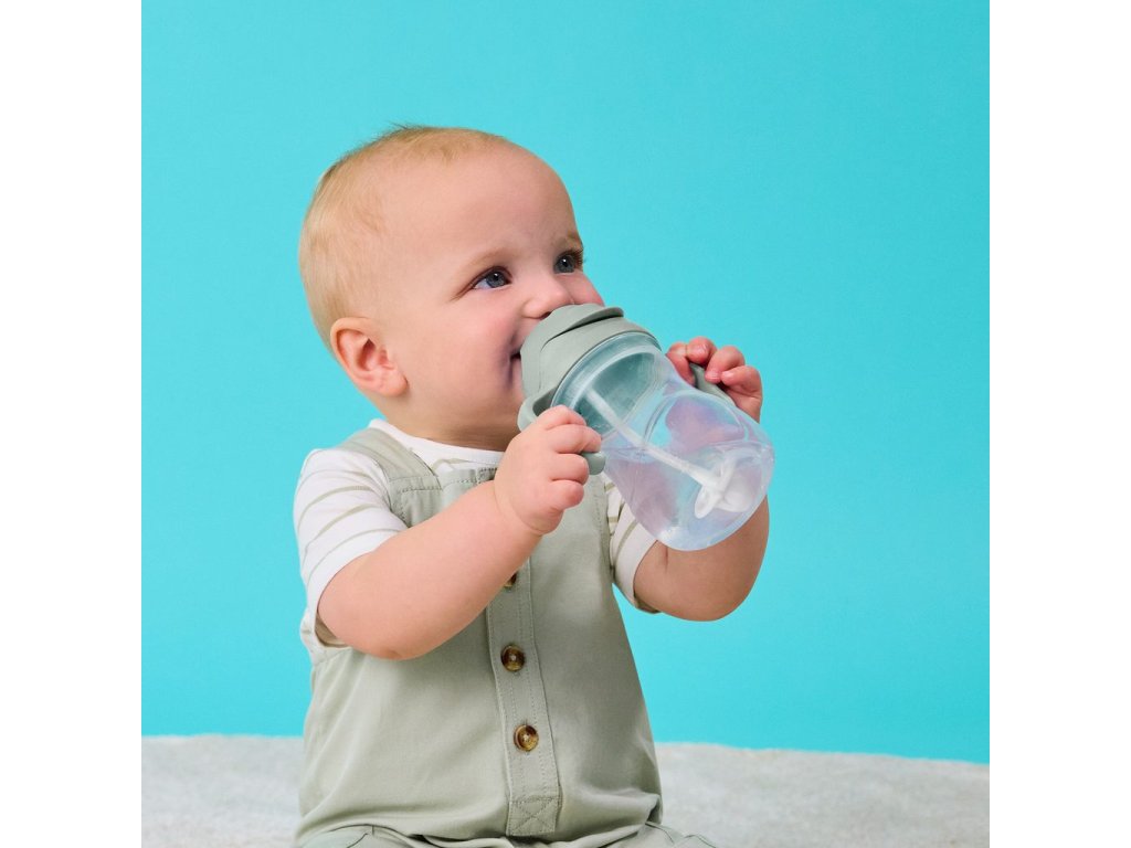 Varovné a bezpečnostné informácie: Niektoré tekutiny môžu spôsobiť zafarbenie produktu. Toto nemá vplyv na funkčnosť produktu a nie je dôvodom na reklamáciu. Nepoužívajte pre tekutiny teplejšie ako 45 ° C, perlivé nápoje, džúsy s dužinou alebo na instantné dojčenské mlieka (platí pre slamku). Nie je vhodné pre deti mladšie ako 4 mesiace. Slamka nie je určená pre deti mladšie ako 6 mesiacov. Nenechávajte dieťa slamku ani cumlík hrýzť! Časté a dlhodobé sanie tekutín môže spôsobiť vznik zubného kazu. Nenechávajte dieťa bez dozoru dospelej osoby. Nikdy nepoužívajte cumlík alebo slamku ako cumlík. Nenechajte dieťa pri používaní s produktom behať alebo sa inak pohybovať. Pred každým použitím skontrolujte, či sú všetky časti produktu v poriadku a pri známkach opotrebovania zlikvidujte. Obaly a nepoužívané časti uchovávajte mimo dosahu detí. Nenechávajte na priamom slnku alebo pri zdroji tepla. Nepatrí do mrazničky ani mikrovlnnej rúry, okrem samotnej základne, ktorá sa dá používať v mikrovlnnej rúre.