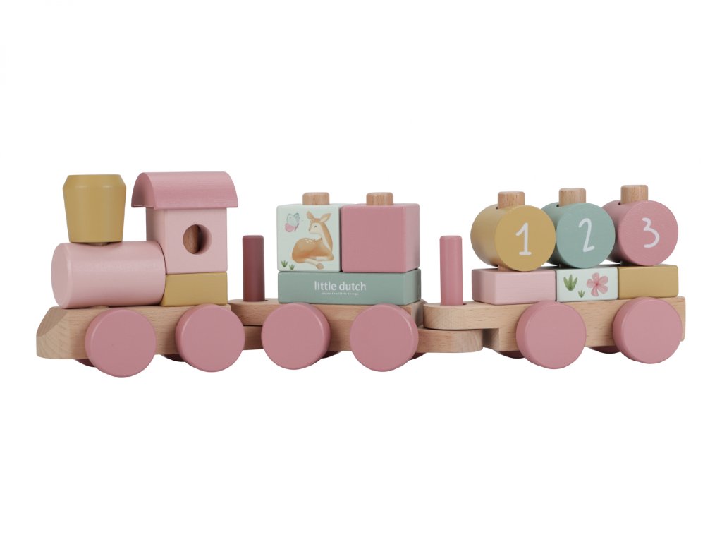 Krásny drevený vláčik z dielne Little Dutch je potlačený obrázkami motívov zo života na záhrade. S kockami rôznych tvarov a farieb môže vaše dieťa zostavovať rôzne varianty vagónov.