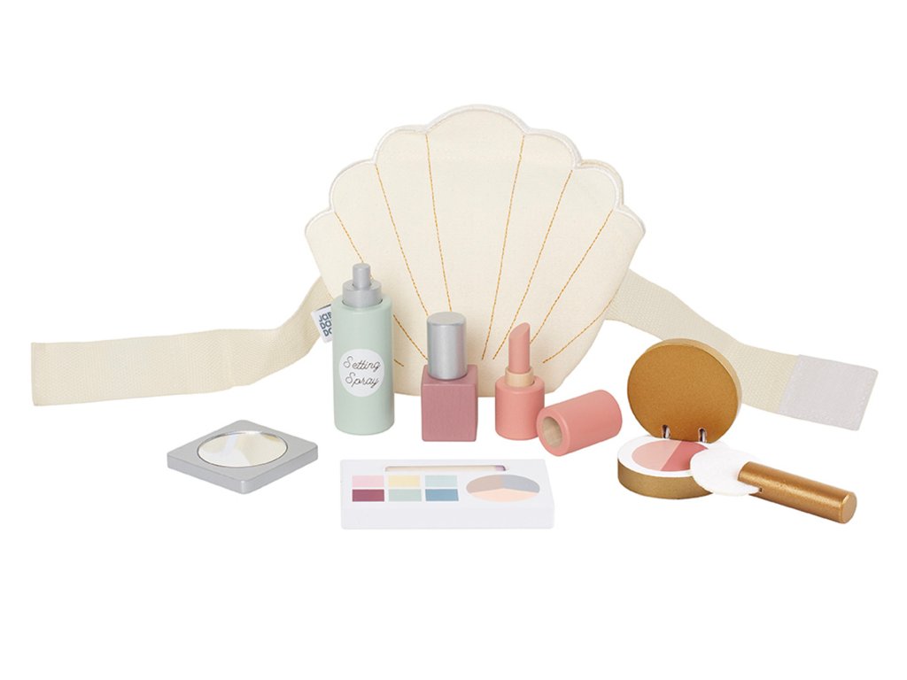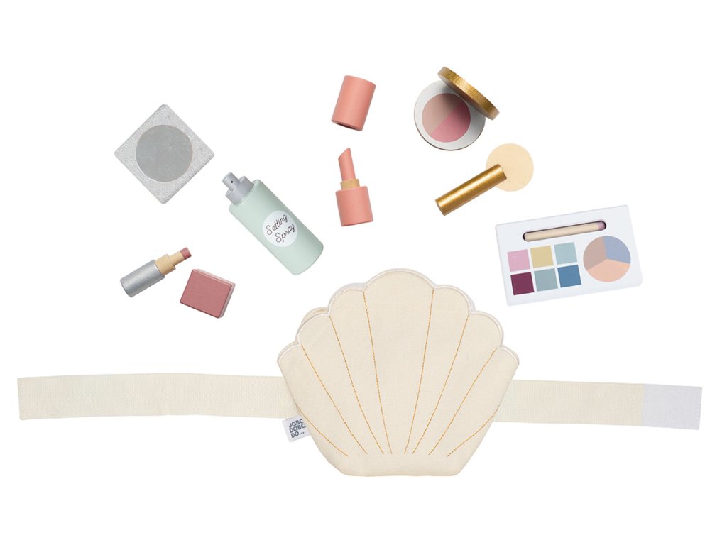 Vitajte v salóne krásy! Ako sa chceš dnes nalíčiť? Make-up opasok od Jabadabado obsahuje všetko, čo potrebujete, aby ste sa stali skutočnou malou vizážistkou. Teraz môžete pred večierkom upraviť štýl všetkých svojich zákazníkov. Nalakujte nechty, naneste lícenku a očné tiene, pred dokončením rúž a fixačný sprej. Pozrite sa do zrkadla a ukážte skvelý výsledok. S make-up opaskom môžete svoj make-up jednoducho nosiť so sebou, kamkoľvek idete. Opasok má tvar roztomilej mušle.