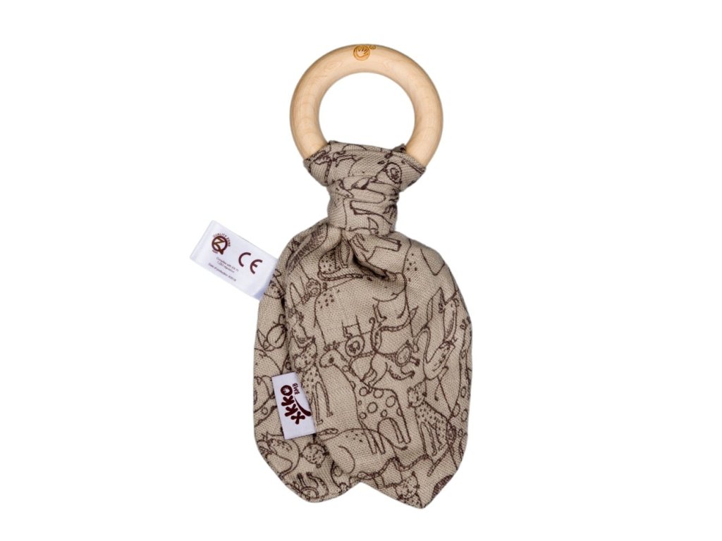 Drevené hryzátko XKKO BMB so šuštivými lístkami z extrémne jemného bambusového mušelínu. Bambusová viskóza je antibakteriálna a nespôsobuje žiadnu alergickú reakciu.