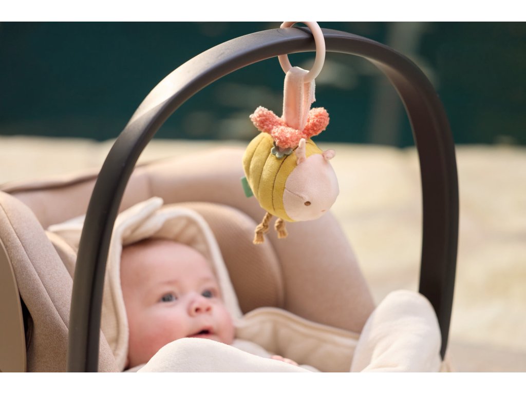 Nežná závesná hračka v podobe včielky je ideálnym spoločníkom pre vaše bábätko na prechádzkach a výletoch. Hračka z mäkkého príjemného materiálu pri pohybe jemne cinká a pri stlačení šuštia. Vďaka plastovému krúžku ju ľahko pripevníte na kočík alebo autosedačku.
