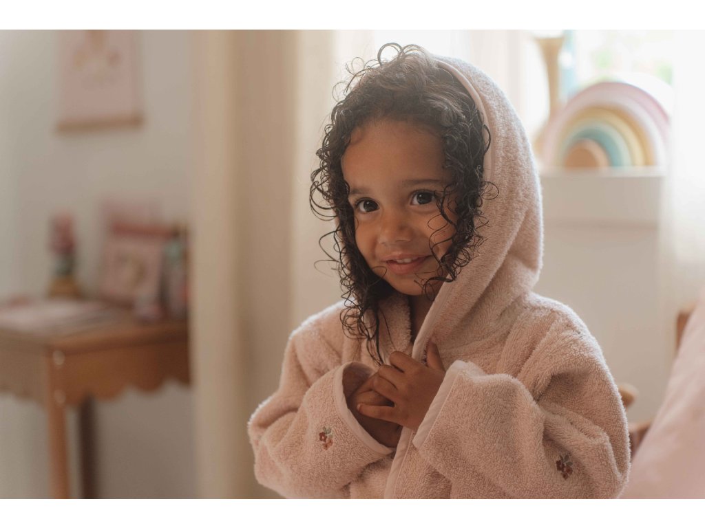 Mäkký froté župan s kapucňou je ideálny pre zahriatie a ľahké osušenie vášho dieťaťa po kúpeli alebo plávaní. Župan z príjemnej 100% organickej bavlny s vyšívanými kvietkami sa zapína s pomocou zaväzovacieho pásika.